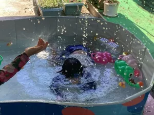 日差しが強いのでテントを張り、その下で様々な水遊びを楽しんでいます🎵