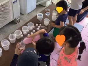 絵の具や食紅を使っていろいろな色水を作りました。色とりどりの色水、カラフルでとっても綺麗ですね✨