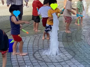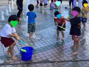 毎年夏になると広い噴水で水遊びができるので、どのクラスでも利用させていただいています。ありがとうございます。<(_ _*)>