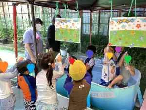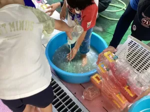クラスにより水量を変え、また温湿度計で気温と湿度を確認しながら、安全に水遊びを楽しめるように配慮しています。