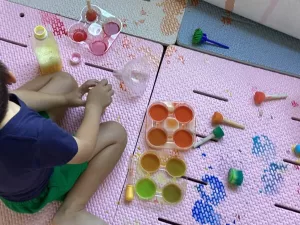 水遊びは、絵の具や片栗粉などを使った感覚遊びと組み合わせて行うことも多いです。