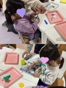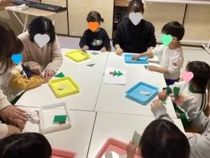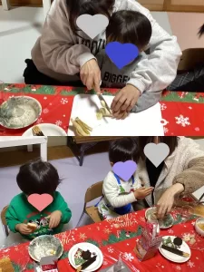 お菓子をお箸で取って紙皿からツリー皿へと移します。大人は利き手ではない手でチャレンジしてもらい、親子で楽しみました✨