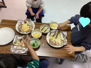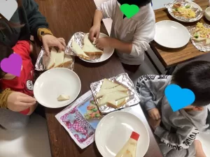 オーブントースターで焼いて、チーズがいい感じに溶けてきたらできあがり✨みんな揃って「いただきまーす!」