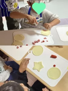 ピザ生地は〇のままでもいいし、切り込みを入れて☆にしてもOK😊小学生は包丁さばきもおてのもの!しっかりと猫の手を作って慎重に切っていきます。