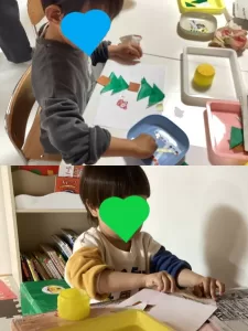 ぶどう組さんは大きな三角の画用紙を線に沿って切り、ツリーのパーツを3つ作ります。さすがは年長さん、ハサミ使いもとっても上手😊